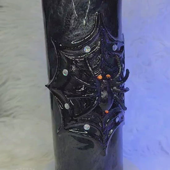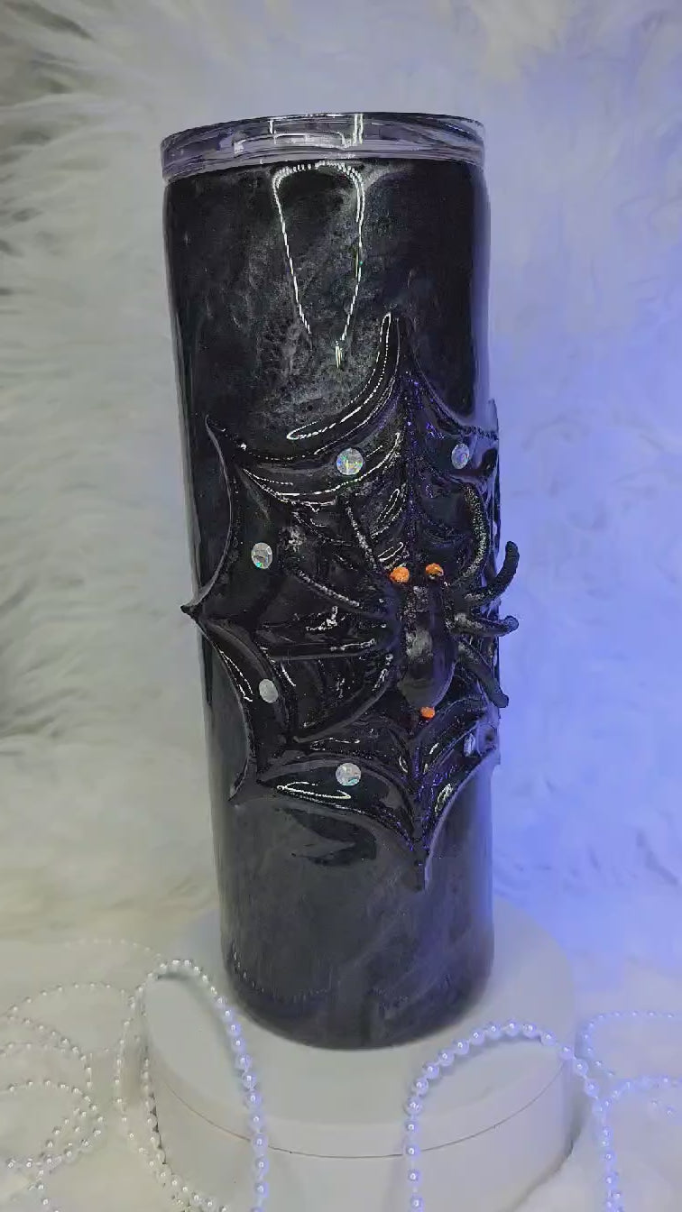 20 oz. Skinny Halloween Themed Custom Designed Tumbler with black marble base, 3-D silhouette spider web, spider, and diamond bling. Comes with lid and plastic straw accessories. All designs are created with love.