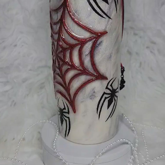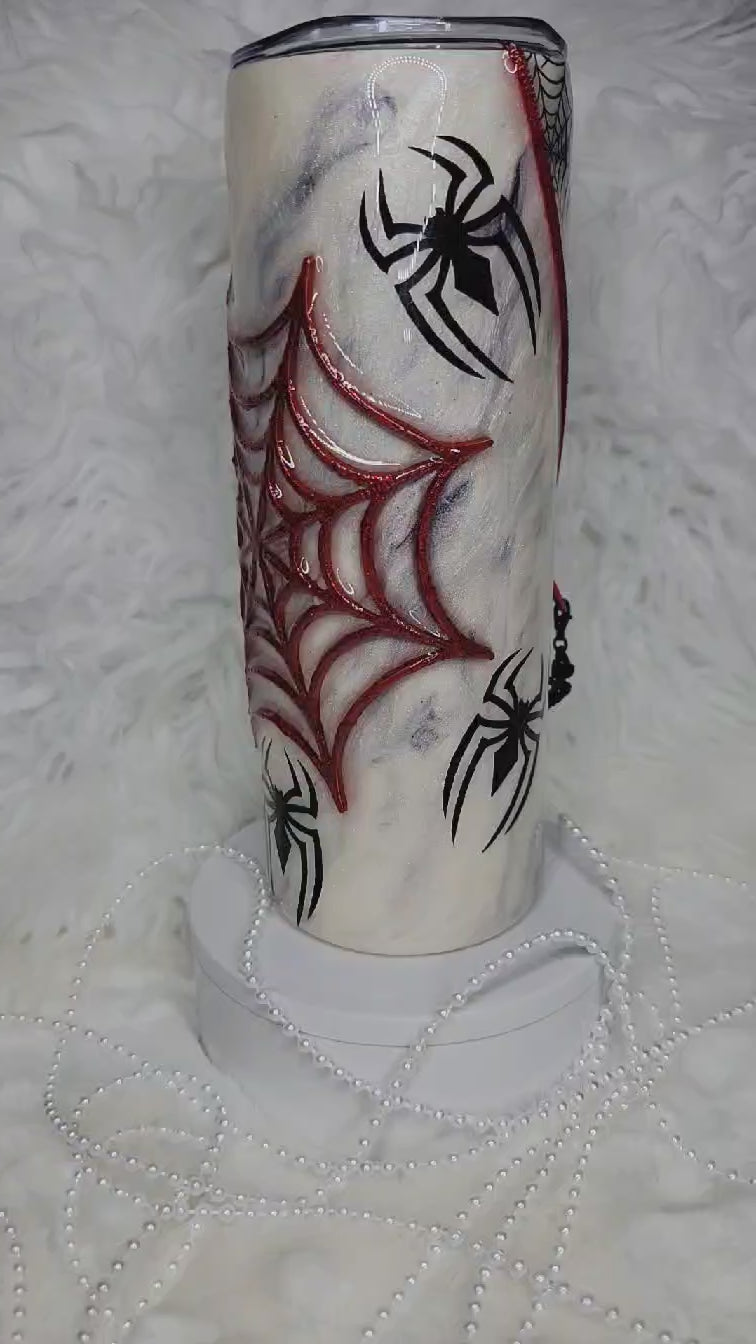 20 oz. Skinny Halloween Themed Custom Designed Tumbler with marble base, silhouette spider web, vinyl, and zipper design. Comes with lid and plastic straw accessories. All designs are created with love.