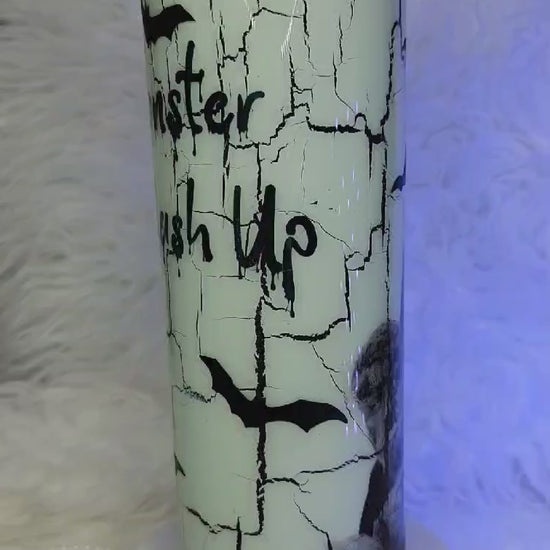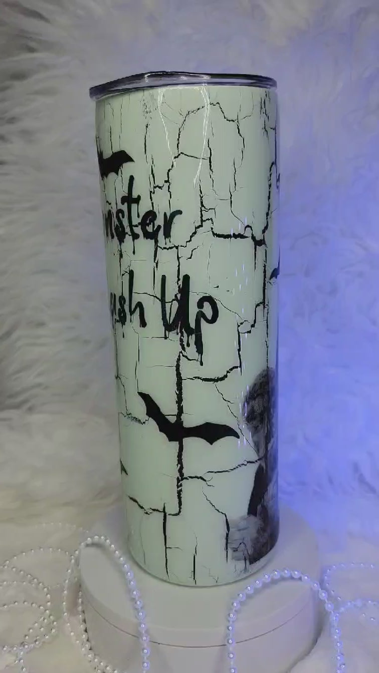 20 oz. Skinny Halloween Themed Custom Designed Tumbler with crackle base. Comes with lid and plastic straw accessories. All designs are created with love.